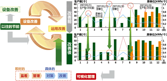以往的設(shè)備節(jié)能是以「引進(jìn)節(jié)能設(shè)備?機器?新技術(shù)」即設(shè)備改善為主體,是針對點的改善。三菱電機認(rèn)為「依據(jù)可視化管理具體把握能量消耗的動向,做到庫華制冷適合化」這種通過可視化管理將設(shè)備改善與運用改善綜合鏈接的活動才是持續(xù)節(jié)能的重點所在。如圖所示: